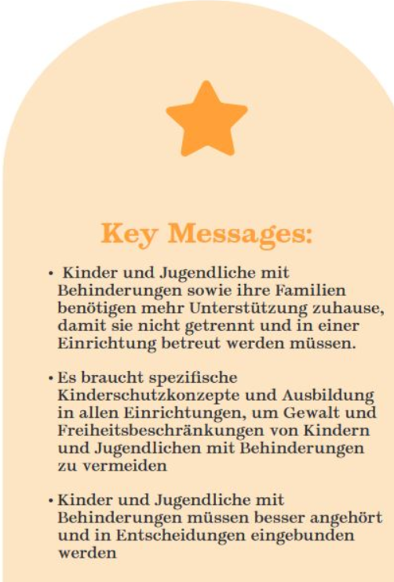 • Ausbau von Beteiligungsmöglichkeiten für Kinder mit Behinderungen in Entscheidungen betreffend Unterbringung, Sicherstellung einer niedrigschwelligen Feedback-Kultur innerhalb von Einrichtungen, partizipative Erstellung von Hausregeln, einschließlich zu Besuchsregelungen und Außenkontakten.